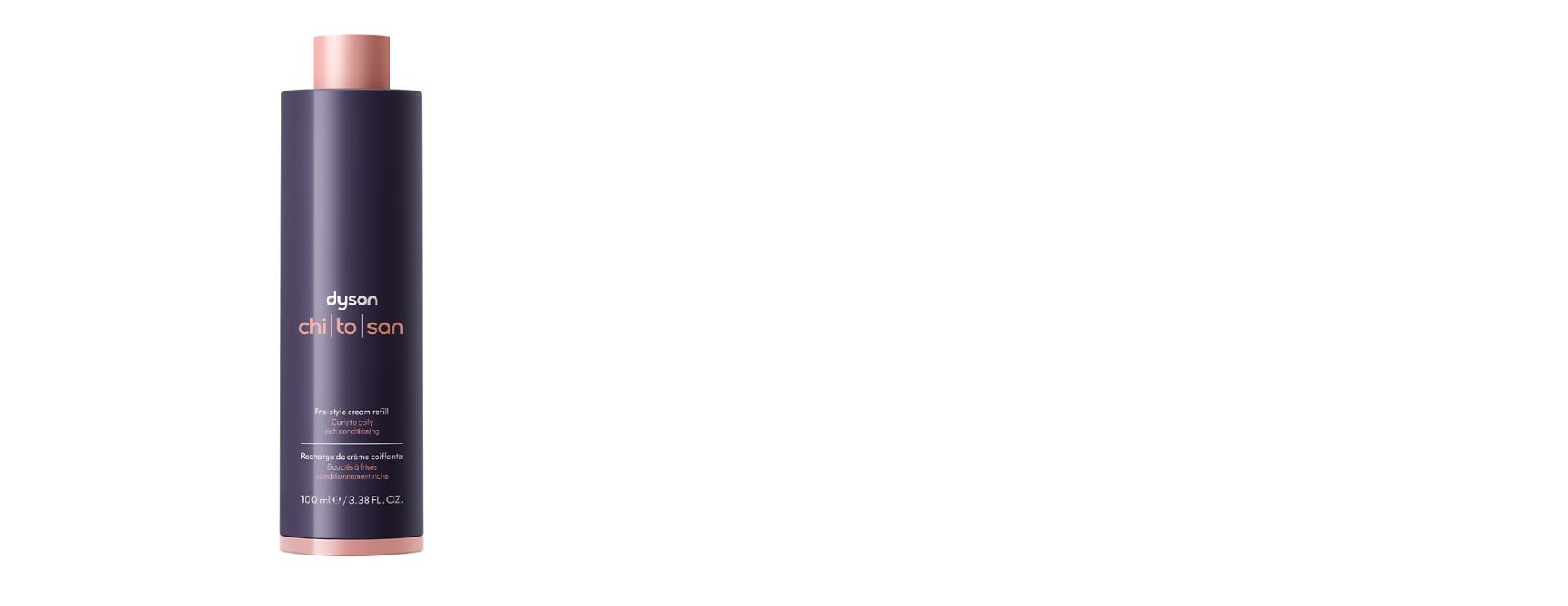 طُوِّر كريم ما قبل التصفيف ™Dyson Chitosan للترطيب الخفيف للشعر المجعّد إلى الملفوف من أجل الشعر الذي يتميّز بتجاعيد حلزونية وتجعيدات صغيرة أو لولبية أكثر إحكاماً أو تجعيدات على شكل حرف S أو أنماط على شكل حرف Z ذات لفائف متقاربة. يتميّز بتركيبة غنية أكثر بالمكونات المُرطِّبة، تشتمل على زيوت بذور الخروع والأرغان، ومن ثمّ يناسب أفضل خصلات الشعر الأكثر سُمكاً وتلك التي بحاجة إلى عناصر مُغذية أكثر كثافةً.